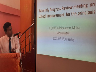 Monthly Progress Review meeting on School improvement for the principals of padzone was held (its 5th meeting in this year) on 18th july 2023 at Bt/PD/Cheddipalayam M.V (Main hall) from 8.30 am onwards with traditional events. The Zonal Director Of Education Presided at the meeting. Deputy Directors of Education, Assistant Directors of Education, Coordinators, Principals, ITDLH staff , PDCT staff, and ISAs attended the Meeting. Firstly officers took their oath in a Meeting. The welcome address was given by Deputy Director of Education - Administration Mrs. T. Rajasekar.